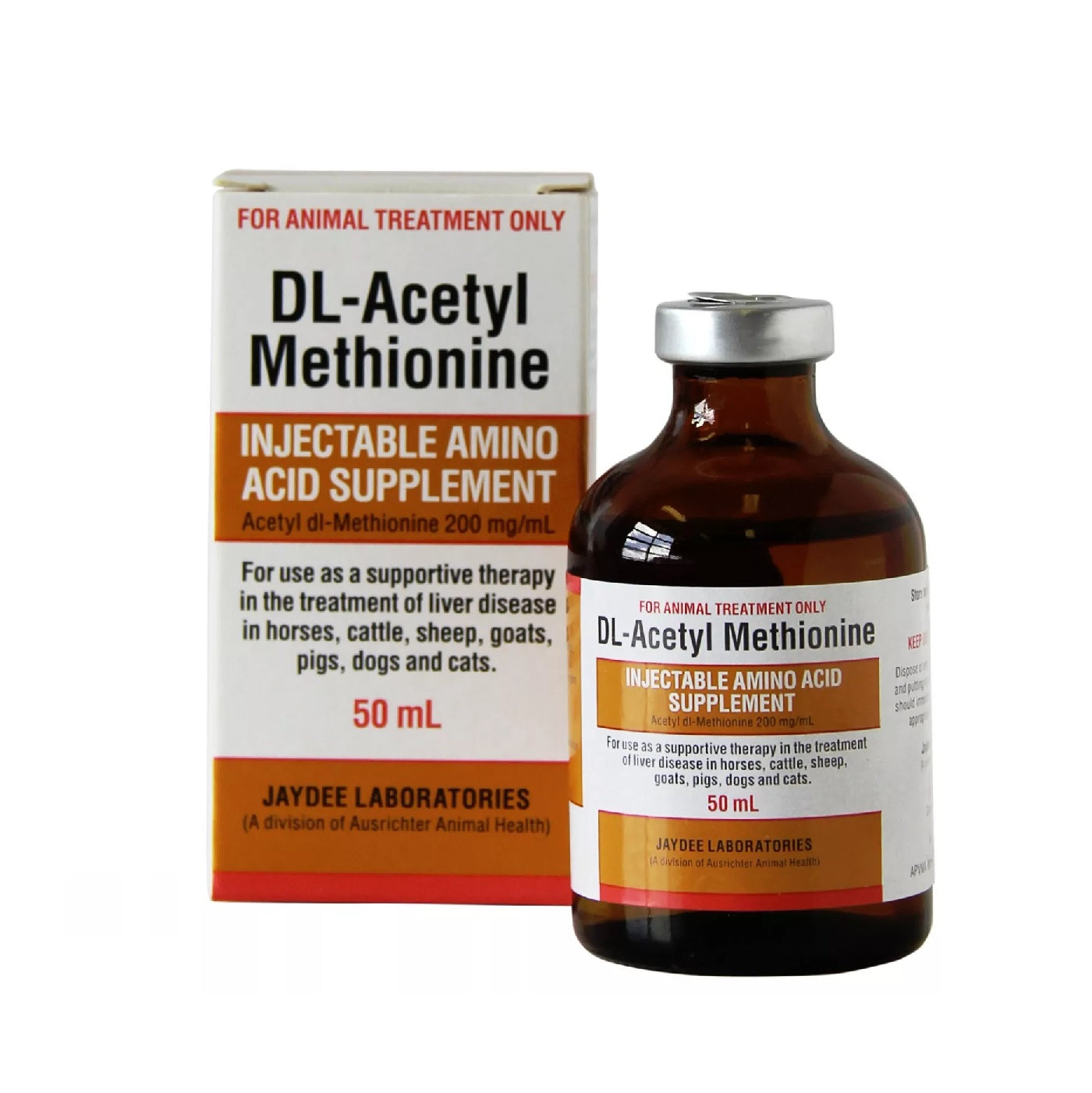 DL-Acetyl-Methionine is an injectable amino acid supplement for use as a supportive therapy in the treatment of liver disease in horses, sheep, cattle, goats, pigs, dogs and cats. Contains Acetyl dl-Methionine 200mg/mL.
