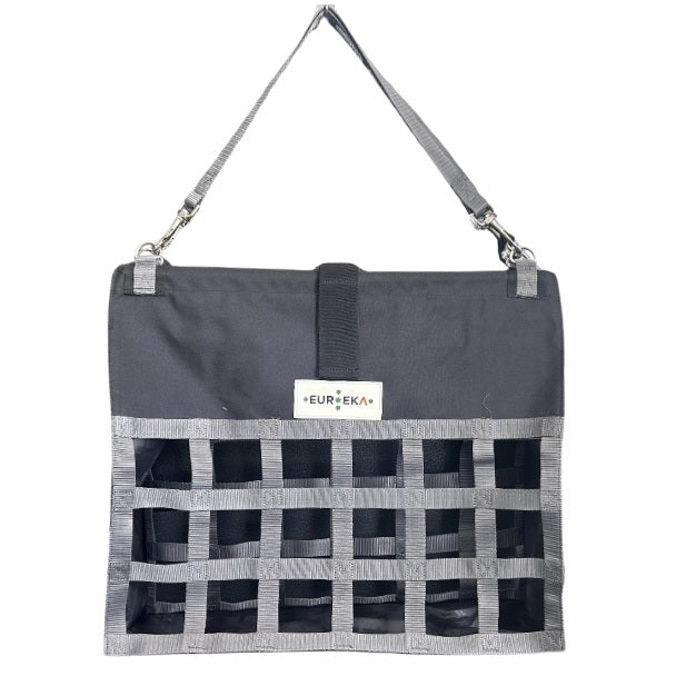 Eureka Slow Feeder Hay Bag with lattice pattern on front in black and grey and solid poles at top closure.