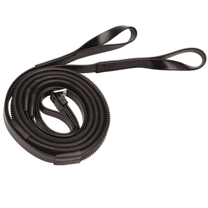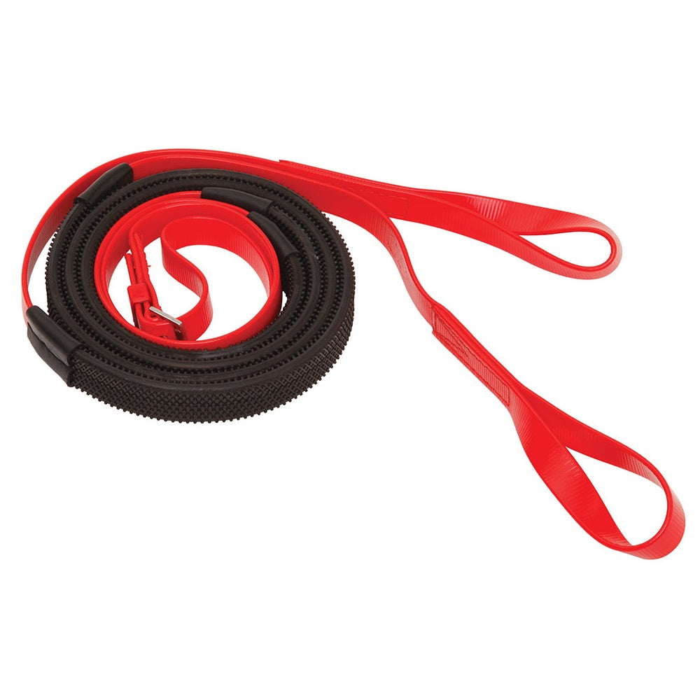 Race and exercise reins are made from woven webbing, covered with a co-polymer, making them strong yet easy to maintain. This material retains flexibility over a large temperature range and is available in a wide range of colours to suit most stable colour schemes.